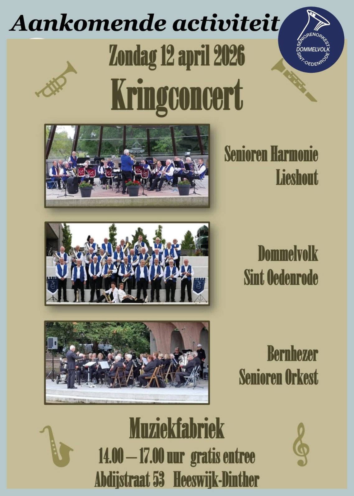 Ben je door het bovenstaande geïnteresseerd om ook op latere leeftijd op een gezellige manier muziek te maken, kom dan eens een repetitie bezoeken op vrijdagochtend. We repeteren van 9.30 uur tot 11.30 uur in Horecagelegenheid "Dommelzicht" te Sint-Oedenrode. Vooral trombonisten (M/V) en klarinettisten (M/V) zijn van harte welkom.